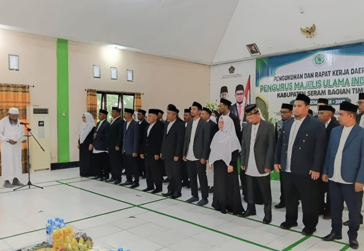 Bula, JENDELASERAM.COM — Pengurus Majelis Ulama Indonesia (MUI) Kabupaten Seram Bagian Timur (SBT) masa khidmat 2025-2029 resmi dikukuhkan oleh Wakil Ketua MUI Maluku, KH. Abu Imam Abdurrohim Rumbara di Aula Kantor Kementerian Agama (Kemenag) SBT pada Senin (29/12/2025).