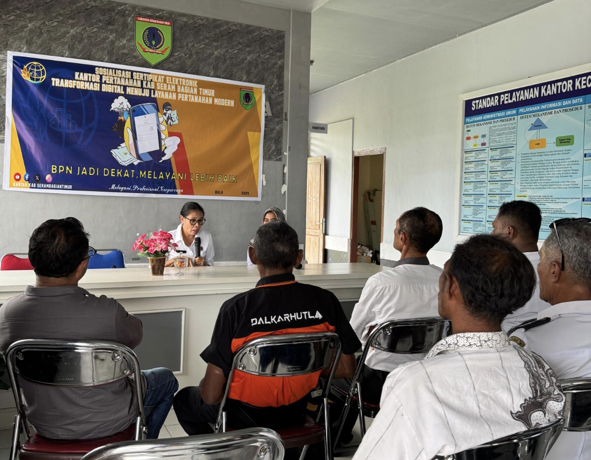 Bula, JENDELASERAM.COM — Kantor Pertanahan Kabupaten Seram Bagian Timur (SBT) melakukan sosialisasi sertifikat elektronik kepada para Kepala Desa (Kades) se-Kecamatan Bula.